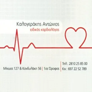 Ο Καρδιολόγος Καλογεράκης Αντώνιος διατηρεί ιδιωτικό ιατρείο στο Ηράκλειο Κρήτης, Μίνωος 127 και Κονδυλάκη 56, 1ος όροφος, όπου δέχεται κατόπιν τηλεφωνικού ραντεβού. Ο ιατρός είναι πιστοποιημένος με τον ΕΟΠΥΥ για ηλεκτρονική συνταγογράφηση.