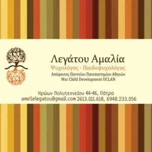 Η κυρία Λεγάτου Αμαλία, ψυχολόγος - παιδοψυχολόγος, απόφοιτος Παντείου Πανεπιστημίου Αθηνών, με εξειδίκευση MSc στην ανάπτυξη του παιδιού και του εφήβου από το Πανεπιστήμιο της Μεγάλης Βρετανίας UCLAN, έχει την έδρα της στην Πάτρα.