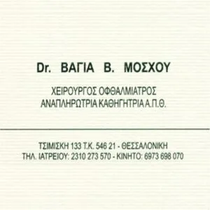 Η Οφθαλμίατρος Μόσχου Βάγια διατηρεί ιδιωτικό ιατρείο στη Θεσσαλονίκη, επί της οδού Τσιμισκή, όπου δέχεται κατόπιν τηλεφωνικού ραντεβού.