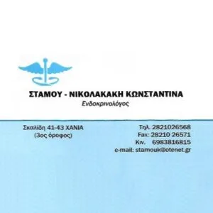 Η Διαβητολόγος - Ενδοκρινολόγος Στάμου Νικολακάκη Κωνσταντίνα διατηρεί ιδιωτικό ιατρείο στα Χανιά Κρήτης, επί της οδού Σκαλίδη Αναγνώστου, όπου δέχεται κατόπιν τηλεφωνικού ραντεβού. Η ιατρός είναι πιστοποιημένη με τον ΕΟΠΥΥ για ηλεκτρονική συνταγογράφηση.