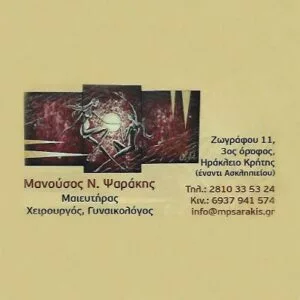 Ο Γυναικολόγος Ψαράκης Μανούσος διατηρεί ιδιωτικό ιατρείο στο Ηράκλειο Κρήτης, επί της οδού Ζωγράφου, όπου δέχεται κατόπιν τηλεφωνικού ραντεβού. Ο ιατρός είναι πιστοποιημένος με τον ΕΟΠΥΥ για ηλεκτρονική συνταγογράφηση.